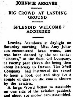Like most pioneering flights to Australia, the first port of call was Darwin, and it was here that Amy Johnson landed on 24 May 1930. The whole story is in the Northern Standard of 27 and 30 May 1930, and here are some excerpts: