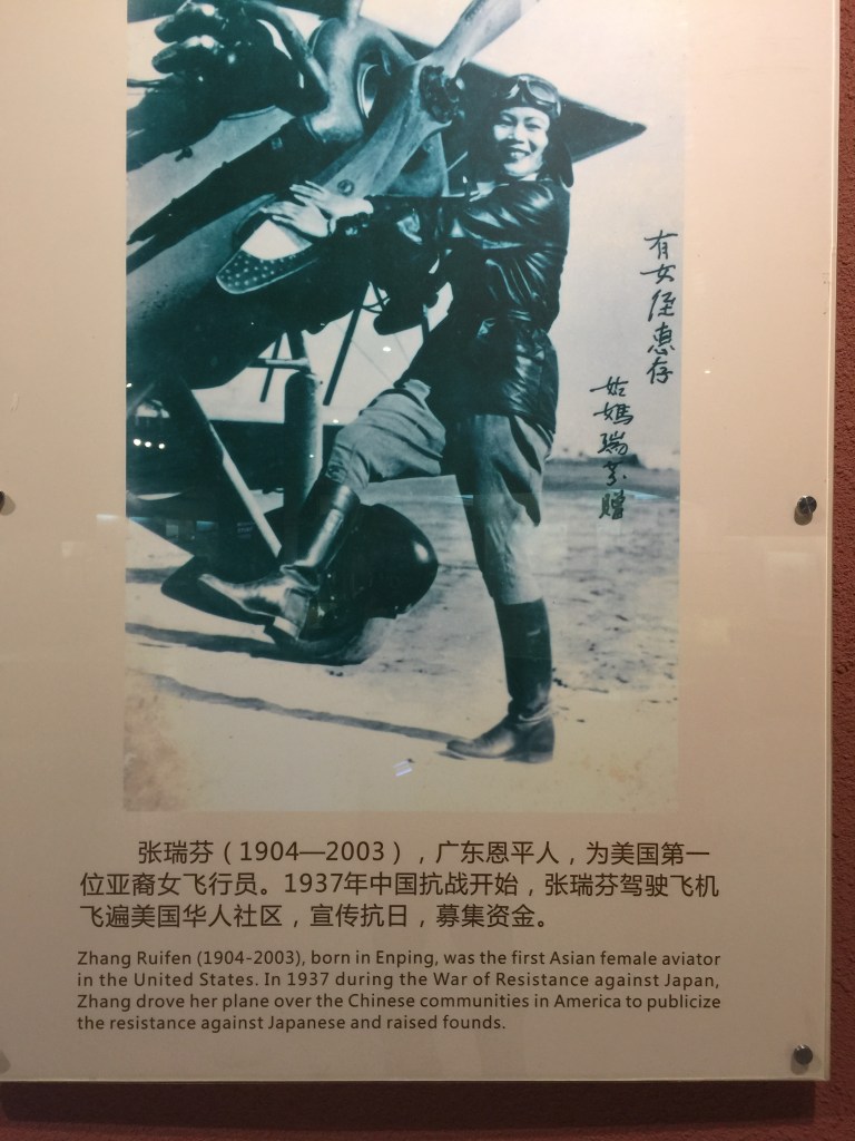 Zhang, also from Enping county, learned to fly in the USA and is claimed to be the first Asian female aviator. Known as Katherine Sui Fun Cheung, she went to the USA in 1917 to study music. Katherine learned to fly with the Chinese Aeronautical Association in Los Angeles, receiving her private pilot licence in 1932 and embarked on a ‘barnstorming’ career. In 1937, following the Japanese invasion of China, she toured USA Chinese communities raising funds for the War of Resistance. Katherine worked as a flying instructor until 1942, when she gave up flying for family reasons and in 2001 was inducted into the International Women in Aviation’s Hall of Fame.